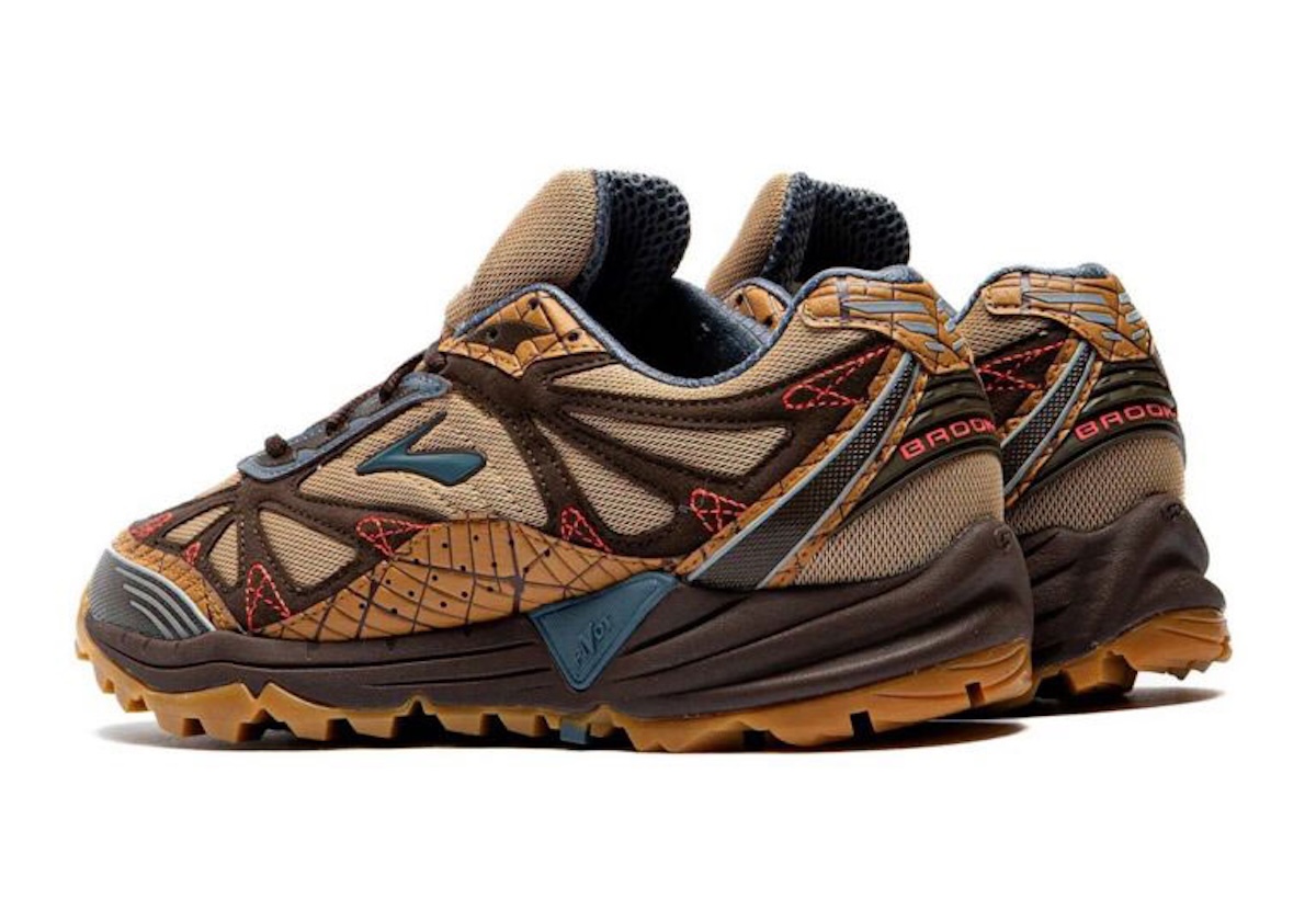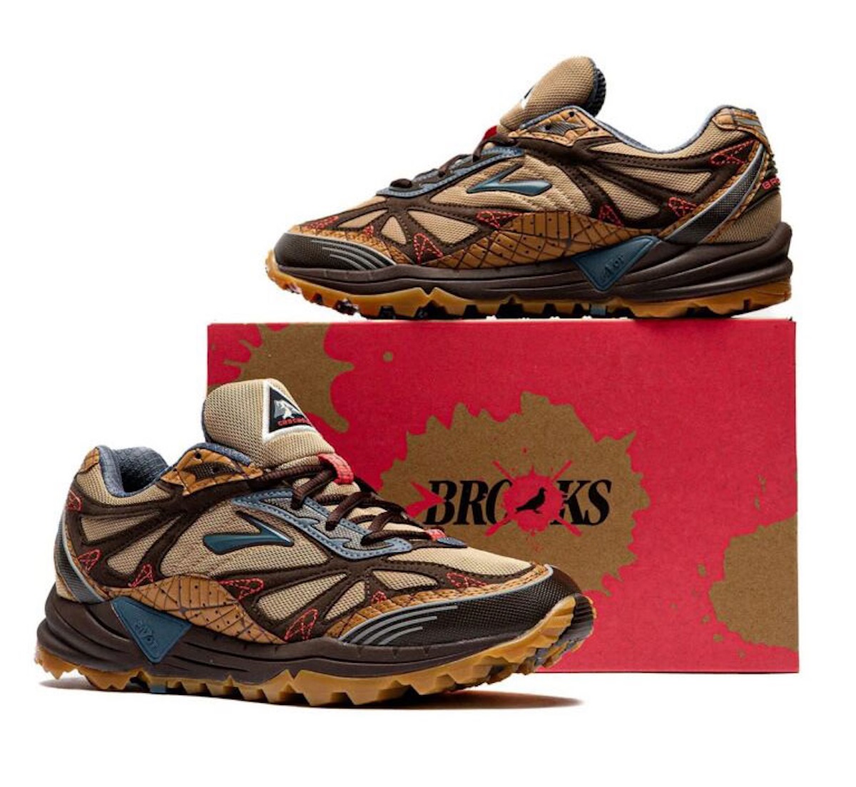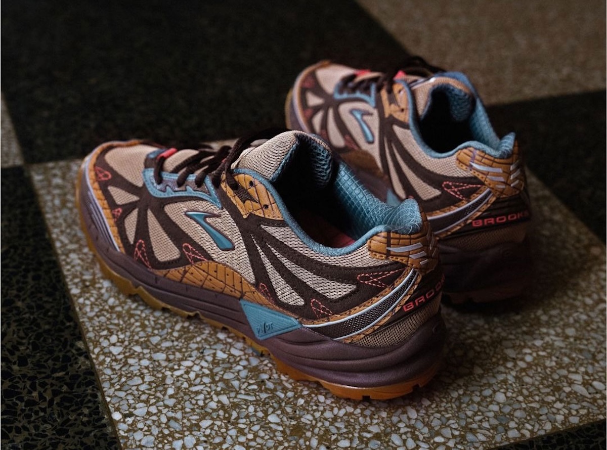 The Cascadia 1 still feels familiar, but isn’t covered in dust. Light brown mesh lives under darker suede and nubuck patterns along the midsole, heel tab, and collar. Red stitches and laces help draw contrast while a gum outsole keeps some trail DNA in the equation. The shoe’s leather even includes a hidden map of New York City stitched in subtly off-kilter lines, ground in Staple’s city.