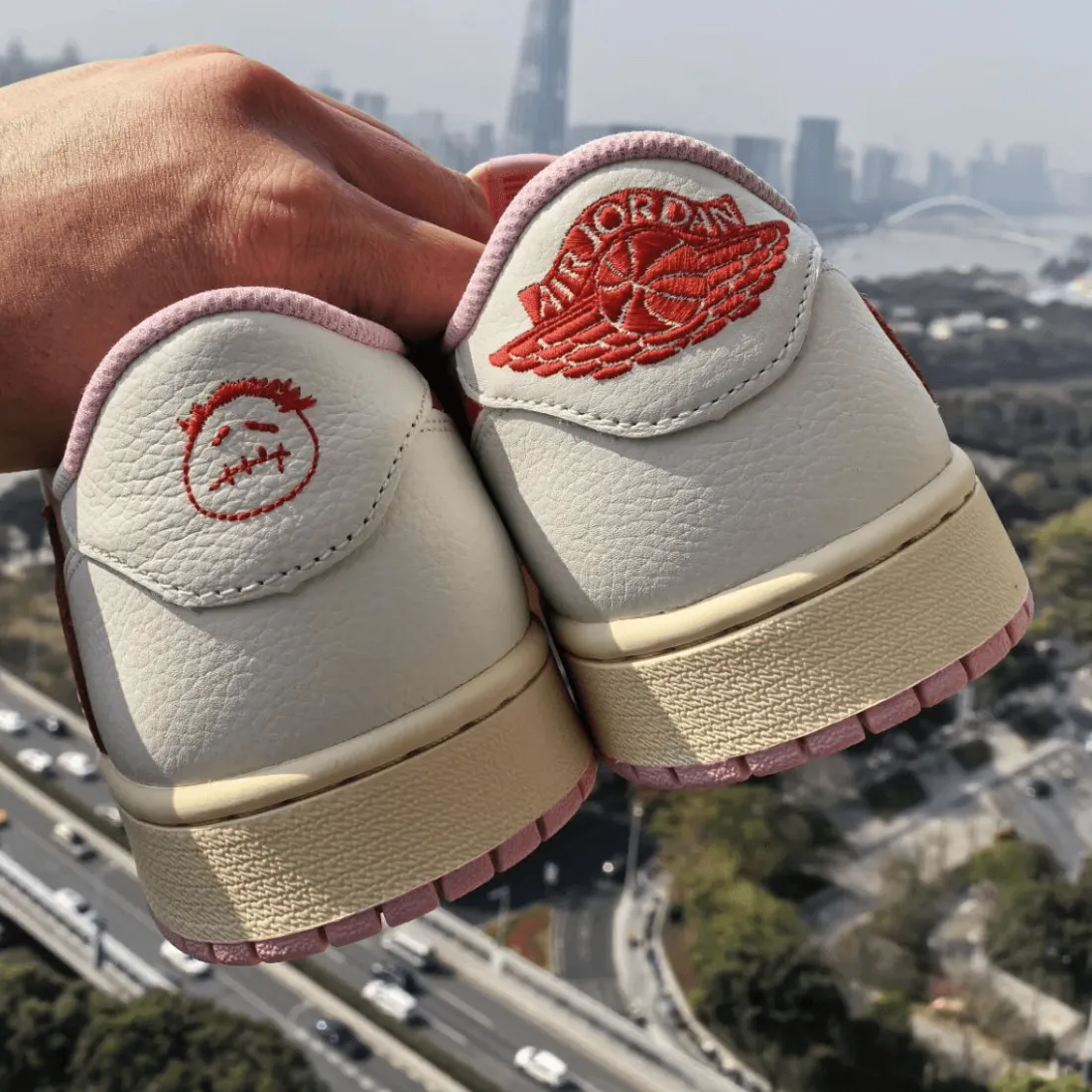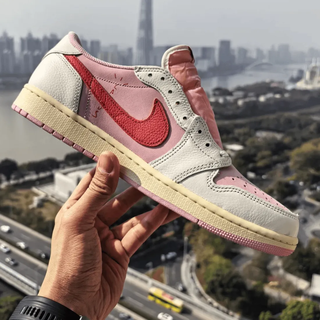 What stands out immediately is the pink suede base paired with deep red reverse Swooshes. The combination feels playful while still keeping Travis’ signature edge intact. Sail leather overlays calm the palette, creating balance across the upper without muting its energy.