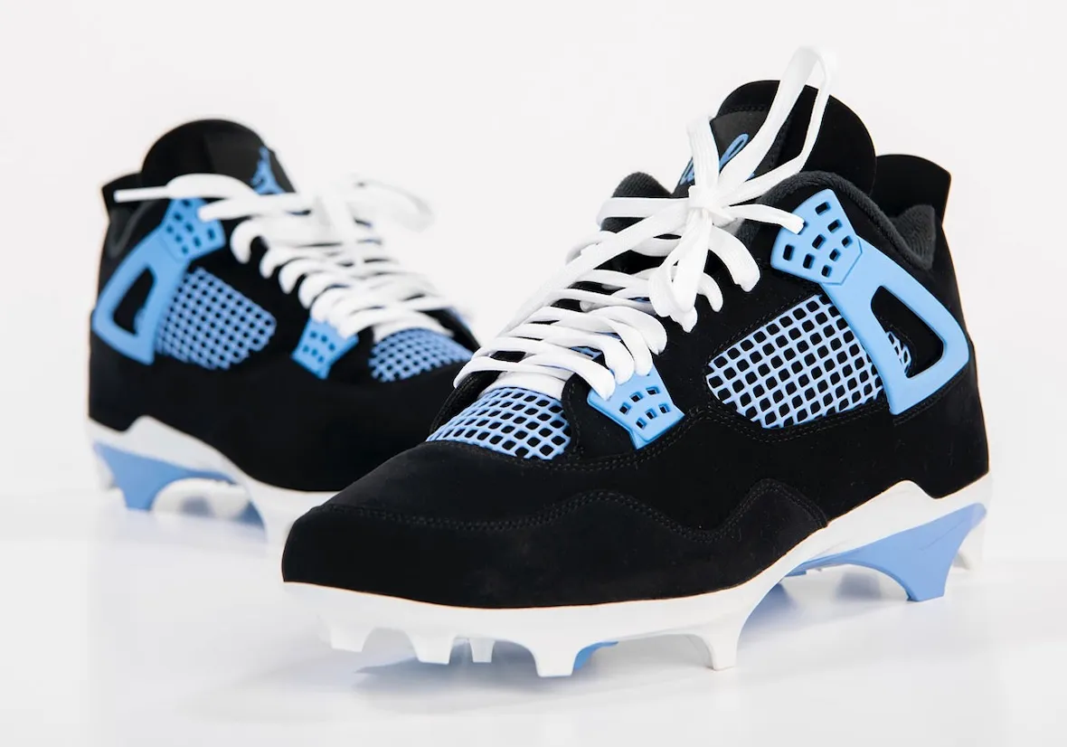 The Air Jordan 4 Cleat features a black nubuck upper, with light blue accents on the netting, wings, and heel branding, with UCLA’s cursive logo embroidered onto the left tongue. White laces and a pop of brighter blue on the cleat plate, is the final touch to the sneaker.