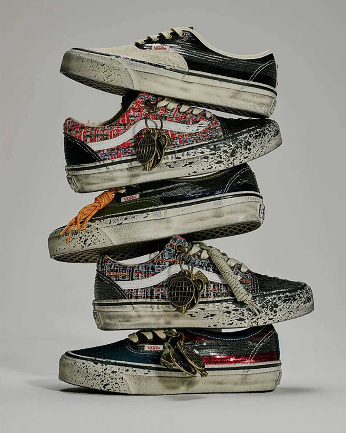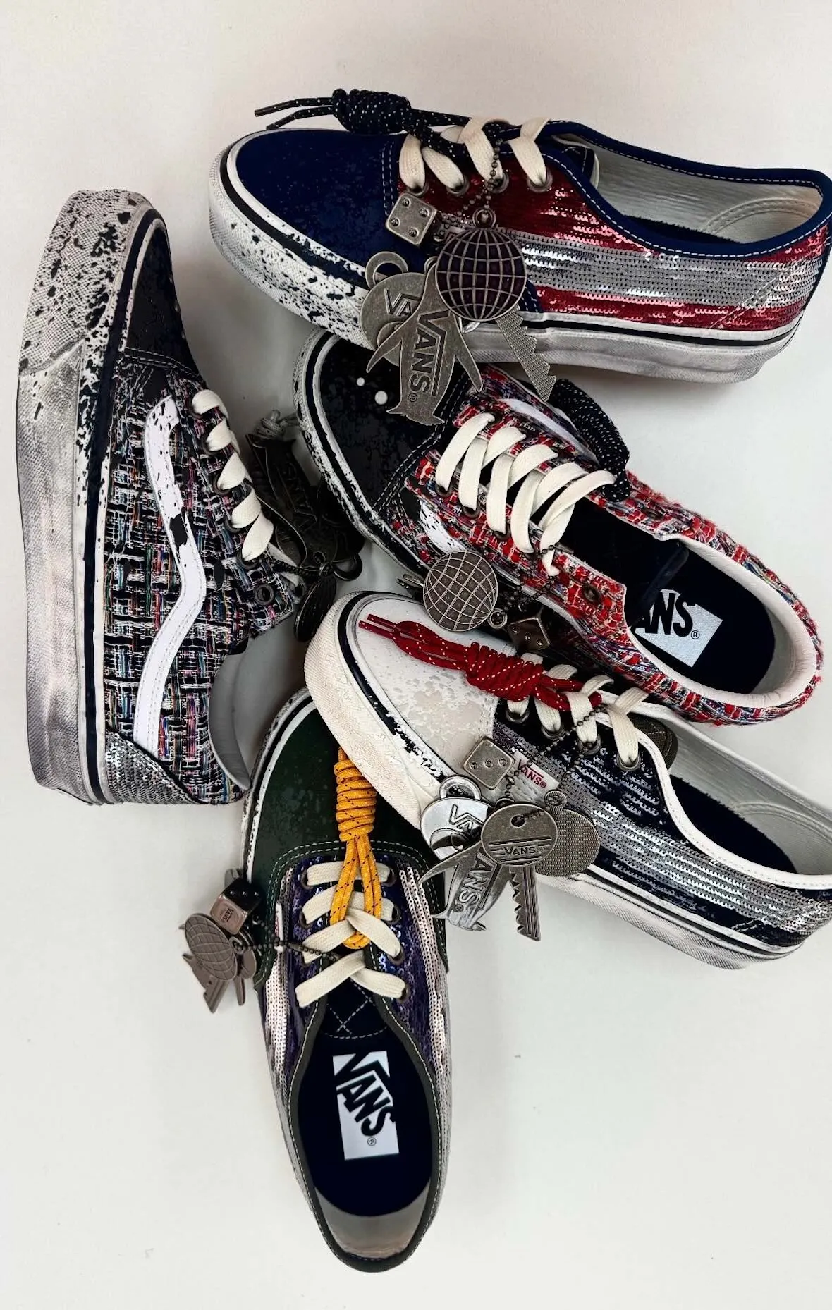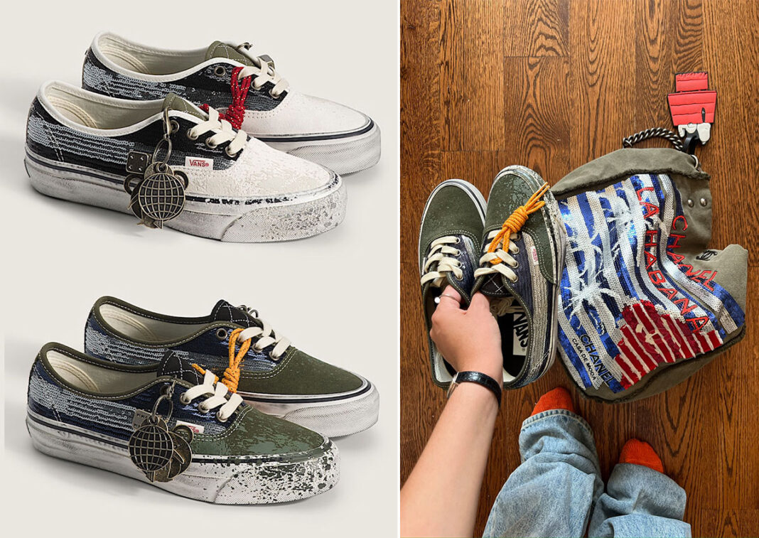 Following up on the Vans Old Skool 36, the look once again pulls from Chanel’s La Habana bag with striped sequin panels and olive canvas sections. Paint splatter adds a raw finish. The pre-worn sidewalls keep things casual. Metal bolts on the heel mirror the bag’s hardware and lock in the concept. Paracord laces and charm keychains add personality. The pair’s influence is a creative nod, not an official collaboration, taking inspiration without suggesting any direct partnership.